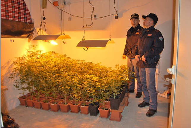 UNA SERRA INDOOR CON 67 PIANTINE. C'erano ben 67 piante di cannabis, alte tra i 70 e i 120 centimetri, un impianto di areazione forzata e controllata composto da aspiratori e termoconvettori, e un sistema di lampade, timer e termometri per tenere sotto controllo umidità e temperatura. Inoltre, nello studio ed in un sottotetto, sono stati sequestrati undici piante di marijuana già essiccate alte circa 80 centimetri, 10 grammi e mezzo di hashish, 7 grammi di marijuana, 250 grammi di foglie di marijuana già essiccate, nonché diverso materiale utile per la coltivazione delle piante quali buste di concime, calendari di germinazione e depliant illustrativi.