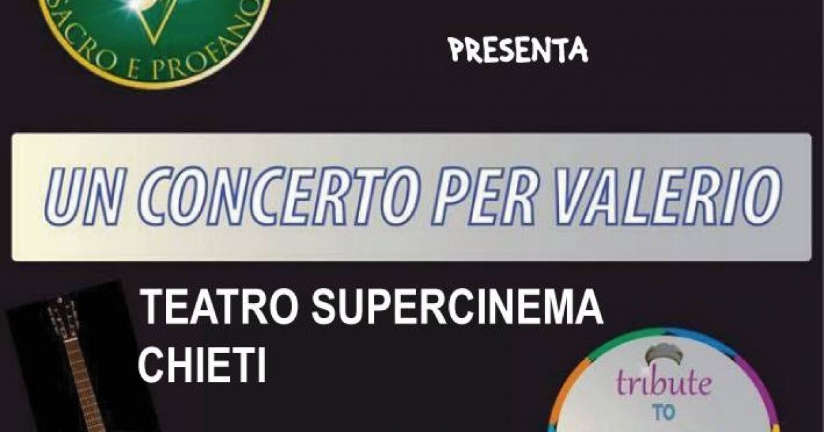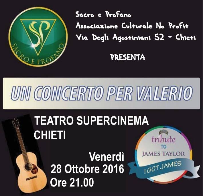 SERATA DI BENEFICENZA A CHIETI PER CONSENTIRE AL PICCOLO VALERIO DI CURARSI. L'Associazione No Profit 'Sacro e Profano', organizza per la sera del 28 Ottobre 2016, presso il Teatro Supercinema di Chieti, un concerto di beneficenza, basato sulle musiche del grande artista americano James Taylor, volto a raccogliere fondi per sostenere il piccolo Valerio, un bimbo di cinque anni, affetto da una rara e grave patologia che lo costringe a trascorrere venti ore al giorno attaccato ad un macchinario che gli permette di respirare e nutrirsi. Il ricavato del concerto servirà per aiutare la famiglia del piccolo ad affrontare cure più specifiche negli Stati Uniti. Al fine di poter capitalizzare al massimo la raccolta di tali fondi, oltre alla prevendita dei biglietti al costo di 10 €, é attivo il seguente conto bancario per raccogliere eventuali donazioni.