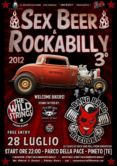 PINETO, TUTTI A BALLARE COL ROCKABILLY - L'Associazione culturale “Incroci” è di nuovo in pista. Il 28 luglio, al Parco della Pace di Pineto (TE), si terrà la terza edizione del festival “Sex, Beer and Rockabilly”. Il festival rock che negli anni passati ha sconvolto la costa abruzzese, quest’anno non sarà da meno: sulla scena infatti due band di livello internazionale: i “The Wild Strings” e i “Bang Bang Bazooka”, la storica band olandese attiva da più di 25 anni! Durante il corso della serata, inoltre, macchine d’epoca e moto sfileranno nei dintorni del parco, dove verrà allestito un mercatino a tema. Preziosissima, infine, la partecipazione di due artisti d’eccezione nel panorama tattoo abruzzese: Donna Mayla di Inside Tattoo e Antonio Felicioni di LUcky 17. Chi lo desidera potrà farsi fare piercing e tatuaggi presso gli stand appositamente allestiti.