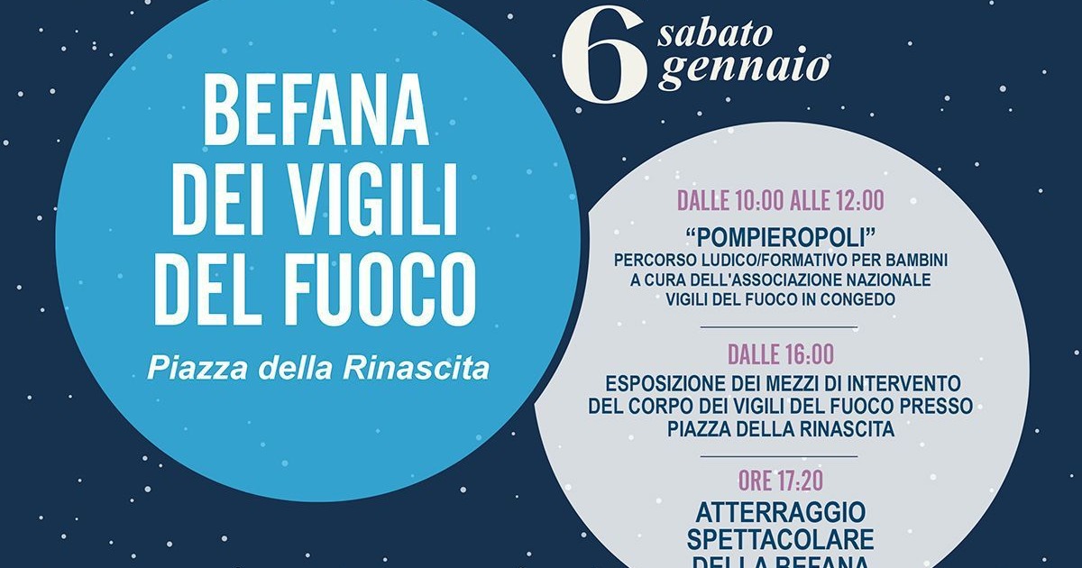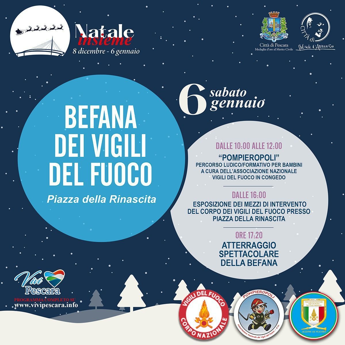 Anche quest’anno i Vigili del Fuoco del Comando Provinciale di Pescara, hanno accolto l’invito dell’amministrazione comunale del capoluogo adriatico per organizzare l’evento “Befana dei Vigili del fuoco”, in considerazione del successo delle precedenti edizioni e dell’entusiasmo che l’evento suscita nei più piccoli. La manifestazione si terrà sabato 6 gennaio in Piazza della Rinascita a Pescara. L’evento aprirà i battenti con ‘Pompieropoli’ che si svolgerà dalle ore 10.00 alle ore 12.00, in collaborazione con l‘Associazione Nazionale Vigili del Fuoco, dedicata ai più piccoli. Successivamente nel pomeriggio, dalle ore 16.00, ci sarà una esposizione di mezzi di soccorso VVF e alle ore 17.15 circa ci sarà la discesa della Befana dei Vigili del fuoco da Palazzo Arlecchino.