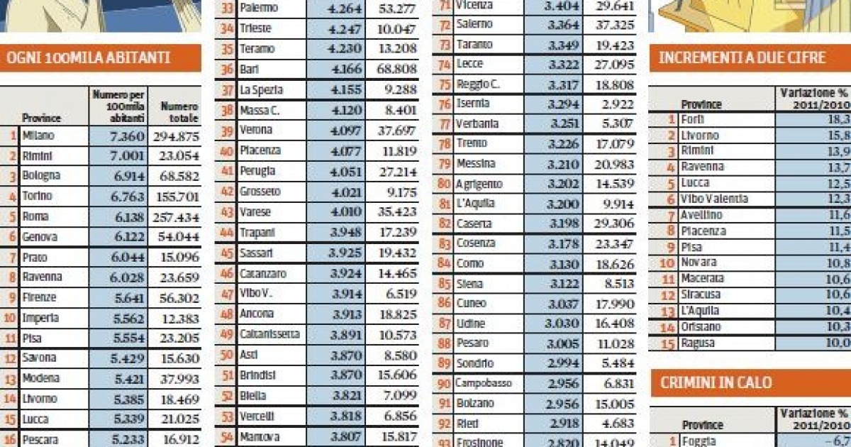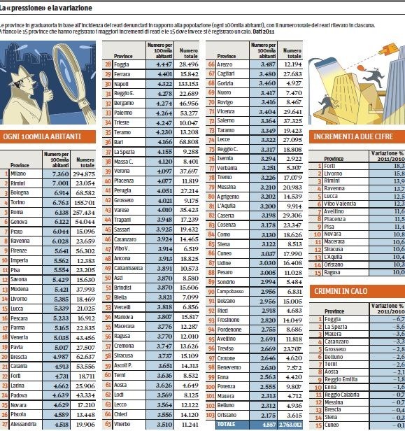 Il 'CASO' PESCARA. Del 'caso' Pescara parla direttamente il Primo cittadino, Luigi Albore Mascia. «I dati sulla Sicurezza pubblicati da Sole 24 Ore - ha detto il sindaco - devono rappresentare sicuramente uno spunto di lavoro e di riflessione per le Istituzioni: da un lato è evidente che Pescara è una città che sta crescendo, nonostante la crisi, divenendo sempre più ‘terra appetibile’ per reati più sofisticati, addirittura ponendosi alle spalle di città come Milano, Torino o Roma, o l’intera regione Toscana presa in blocco con Firenze, Livorno, Pisa, Lucca e Prato, solo per citare alcuni esempi. D’altro canto sapevamo che la crisi economica sempre più forte avrebbe fatto lievitare il numero dei reati, a partire dagli scippi, le rapine e i furti in casa. Oggi si ruba per 60 euro, in strada, sempre meno in banca, dove si rischia di esser presi per i moderni sistemi di allarme. E purtroppo quanto accaduto a Pescara negli ultimi giorni, con due rapine messe a segno ai danni di due imprenditori della città, è sintomatico di quella stessa classifica. Proprio per questa ragione l’allerta è ai massimi livelli, per questo abbiamo difeso la nuova Caserma dei Carabinieri che dovrà tradursi anche in un aumento del contingente nel capoluogo adriatico. Per questo nel giorno di Ferragosto abbiamo predisposto un rinforzo di uomini lungo le nostre strade, con oltre 100 unità operative distribuite in ogni angolo».