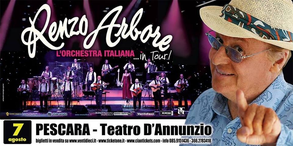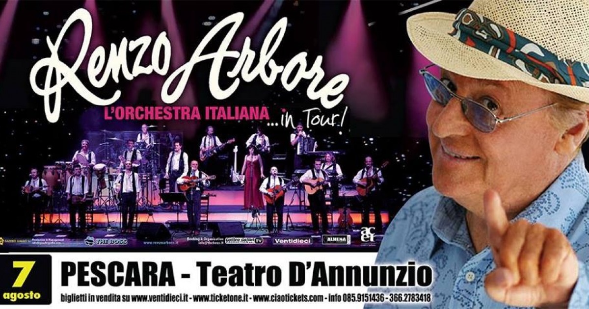 SOLD OUT CONCERTO DI RENZO ARBORE E ORCHESTRA ITALIANA. Tutto esaurito il concerto di Renzo Arbore e l'Orchestra Italiana che, questa sera alle ore 21,15, si esibiranno sul palco del Teatro D'Annunzio di Pescara. Insieme all'artista napoletano, definito lo showman italiano più conosciuto nel mondo e che da anni gira initerrottamente in tournè dal Canada all'Australia riscuotendo un incredibile successo di pubblico, anche 15 talentuosi musicisti “all stars”, come ama definirli egli stesso, tra i quali spiccano l’appassionato canto di Gianni Conte, la seducente voce di Barbara Buonaiuto, quella ironica di Mariano Caiano e i virtuosismi vocali e ritmici di Giovanni Imparato.