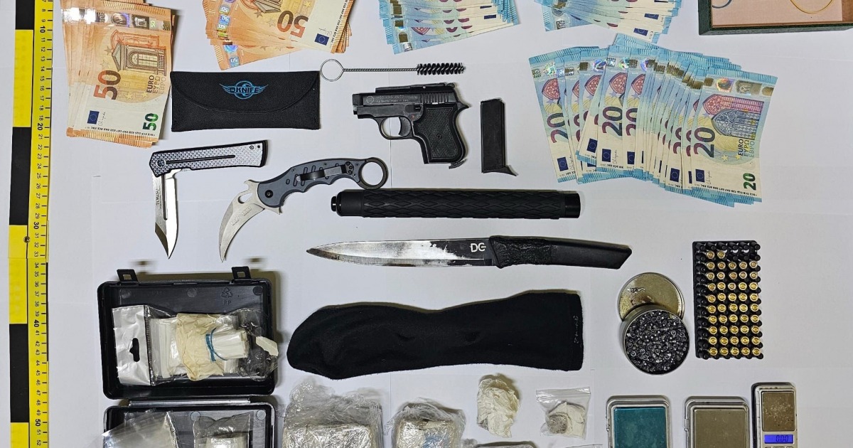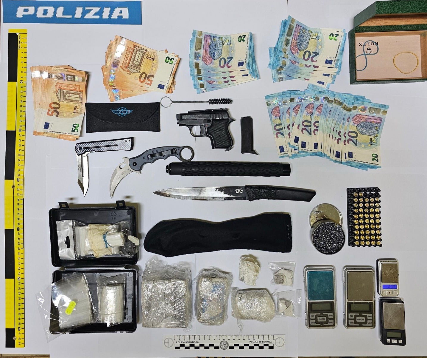 La Squadra Mobile della Questura di Chieti, nella serata del 02.12.25, durante un servizio di controllo straordinario del territorio, finalizzato al contrasto dei reati predatori, ha arrestato due uomini di 20 e 21 anni. Nello specifico, i poliziotti sottoponevano a controllo una vettura, fermandola sul lungomare di Francavilla. L’uomo alla guida, al fine di sfuggire al controllo, tentava di investire uno dei due poliziotti. Ne scaturiva un breve inseguimento, al termine del quale, il guidatore veniva perquisito con esito positivo; negli slip venivano trovate diverse dosi di hashish. Di conseguenza, la perquisizione degli agenti si estendeva al domicilio. In casa, vi era anche il fratello maggiore. L’uomo deteneva una pistola scacciacani con canna modificata ed idonea al fuoco, due bilancini di precisione, 2500€ in contanti, circa 600 grammi di hashish e materiale di confezionamento. Tutto il materiale veniva sottoposto a sequestro e i due uomini venivano condotti nella Casa Circondariale di Madonna del Freddo, accusati di spaccio di sostanze stupefacenti, detenzione di arma da fuoco clandestina e resistenza a pubblico ufficiale.