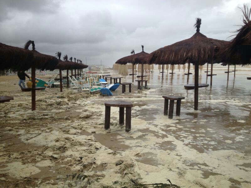 STABILIMENTI DANNEGGIATI DALLA PIOGGIA. La furia di Medea si è abbattuta sulla costa abruzzese. Le abbondanti piogge torrenziale, provenienti dal Nord Europa, si sono rivelate devastanti ed, insieme alle mareggiate delle ultime ore, hanno fatto tanti danni: spiagge praticamente scomparte e stabilimenti balneari danneggiati. Le zone più colpite sono quelle di Alba Adriatica, Roseto, Pineto, Silvi, Montesilvano, Pescara, Francavilla, Ortona, Vasto e San Salvo.