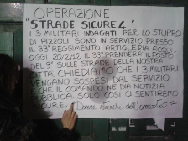 LA REAZIONE DELLA COMUNITA'- Da giorni sono in tanti che prendono la parola su questa terribile vicenda. Ieri il sindaco di Pizzoli, Angela D'Andrea, che ha chiesto alla magistratua di «di fare in fretta ed assicurare alla giustizia i responsabili della violenza». Oggi è stato il turno del comitato "3e32", che sul proprio sito ha chiesto apertamente la sospensione dei militari dalla Caserma "Acui". «Ci sembra assurdo - scrivono quelli del 3e32 - ma apprendiamo che oggi i tre caporali del 33esimo reggimento Acqui indagati per lo stupro di Pizzoli rientrano in servizio dopo un breve congedo nel giorno in cui lo stesso reggimento prende il posto degli Alpini nei servizi di pattugliamento del centro storico nell’ambito dell’operazione “Strade Sicure. Ci sembra il minimo quindi chiedere al 33esimo Reggimento Artiglieria Acqui e alle istituzioni competenti che i tre caporali indagati per il violentissimo stupro vengano immediatamente sospesi dal servizio in via precauzionale e che di questo venga reso nota pubblicamente. Vogliamo la certezza di non trovare questi indagati per stupro a svolgere un qualche ruolo di tutori dell’ordine nell’ambito di un’operazione chiamata “strade sicure”. In caso contrario non ci verrebbe più data la possibilità di fare distinzione. Abbiamo sempre criticato la militarizzazione della nostra città come abbiamo sempre detto che il garantismo per noi è un valore. Questo non è garantismo: è omertà complice degli stupri e della cultura della sopraffazione che li sottende. Non possiamo stare a guardare. Chiediamo al 33° Reggimento Artiglieria Acqui e alle istituzioni competenti che i tre caporali indagati per il violentissimo stupro a Pizzoli vengano immediatamente sospesi dal servizio in via precauzionale e che questo venga reso noto pubblicamente»