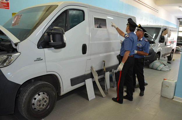 Una volta entrati nel garage sono stati rinvenuti quattro mezzi parcheggiati, privi di targhe e parzialmente coperti da teloni. Si trattava di due Fiat Punto, nascoste dietro un mezzo da lavoro ed un fuoristrada, e due furgoni Fiat Ducato, parzialmente coperti da due pesanti teli in nylon. Già dai primi accertamenti le auto apparivano subito di provenienza sospetta in quanto avevano i nottolini delle portiere lato guida manomessi ed i fili elettrici dell’impianto di accensione sotto il volante tagliati. Ma la scoperta più inquietante è stata fatta quando sono stati rimossi i teli che coprivano i furgoni: entrambi i mezzi, infatti, presentavano modifiche nella carrozzeria tali da renderli identici a furgoni portavalori, con interventi ai portelloni laterali, ove erano state ricavate due feritoie, alle portiere dell’abitacolo ed al parabrezza anteriore, in modo da conferire un’apparente blindatura. Probabilmente i responsabili di questo progetto delittuoso avrebbero completato l’opera applicando una serigrafia di un Istituto di vigilanza.