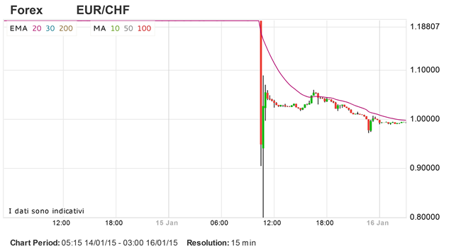 FINANZA: SUI MERCATI E' ALLE PORTE UN MOVIMENTO IMPORTANTE. Svizzera, Bce e Grecia: un inizio d’anno col botto! La Banca nazionale svizzera, il QE in Europa e le elezioni in Grecia potrebbero essere la scusa per far partire sui mercati un movimento di una certa entità. Partiamo dalla Svizzera, giovedì scorso, con una mossa a sorpresa la Snb ha deciso di chiudere il cambio fisso del franco contro euro fissato a 1,20 lo scorso 2011. La decisione fu presa a quei tempi per non far apprezzare ulteriormente la moneta favorendo le esportazioni e la tenuta dell’economia. Tale decisione ha provocato un movimento sul mercato forex credo senza precedenti nella storia, il cambio EUR-CHF si è portato da 1,20 a 0,85 in un quarto d’ora. Grande apprezzamento del franco proprio quello che non volevano gli svizzeri e crollo della borsa, un calo a doppia cifra per lo Smi. Molto probabilmente infatti la rivalutazione della moneta elvetica porterà la Svizzera in recessione.