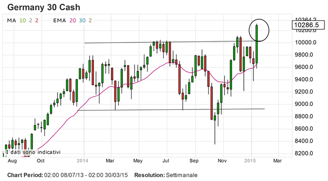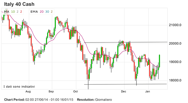 Molto probabilmente in Svizzera hanno pensato che non sarebbero stati più in grado di sostenere il cambio fisso ad 1,20 con alle porte l’inizio del quantitative easing in Europa, dopo anche il via libera dato giorni prima dalla corte Ue. Anche sulle borse si è avuto un forte movimento al ribasso per poi risalire, in Europa i mercati hanno chiuso fortemente positivi. La chiusura del dax anche sul weekly sui massimi non è da sottovalutare. Altro evento importante sarà giovedì prossimo la tanto attesa riunione della Bce. Saranno proprio le scelte di Draghi e l’inizio del QE in Europa a dare finalmente il via ad un movimento direzionale e di una certa entità sul mercato? Il mercato credo che abbia già scontato l’inizio del QE, ma come sarà, la portata e le modalità saranno più chiare solo giovedì. E’ possibile che Draghi faccia più chiarezza ma magari rimandi l’inizio, forse per aspettare le elezioni in Grecia di domenica prossima altro appuntamento importante da tenere d’occhio. Sarà il mercato europeo la scommessa da cavalcare nel 2015 come dicevo qualche mese fa?