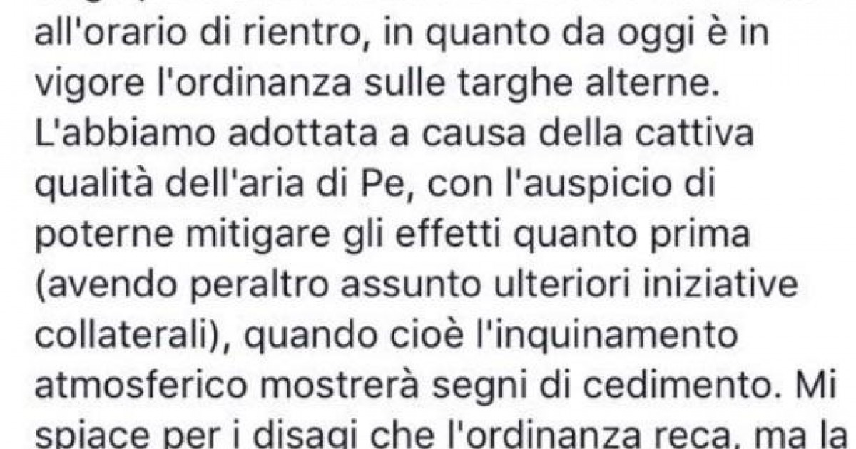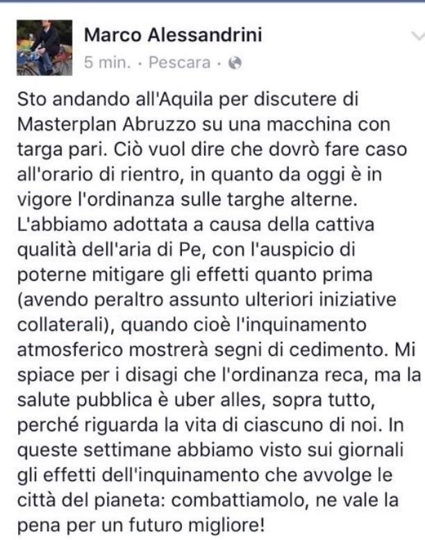 FOLLIA. Fa quasi tenerezza, Marco Alessandrini, per come inciampa in qualunque cosa gli si pari davanti. Questa mattina il sindaco di Pescara è scivolato su un post pubblicato sul suo profilo Facebook. Soprattutto, Alessandrini ha avuto la “sfiga” che quel post sia stato immediatamente visualizzato e “screenshottato” dal capogruppo regionale di Forza Italia, il pescarese Lorenzo Sospiri, al quale non è sembrato vero di beccare Zagat in flagranza di gaffe. Ricordiamo che oggi entravano in vigore, nel capoluogo adriatico, le targhe alterne, e il buon Marco aveva scritto: “Sto andando all'Aquila per discutere di Masterplan Abruzzo su una macchina con targa pari. Ciò vuol dire che dovrò fare caso all’orario di rientro, in quanto da oggi è in vigore l'ordinanza sulle targhe alterne”.