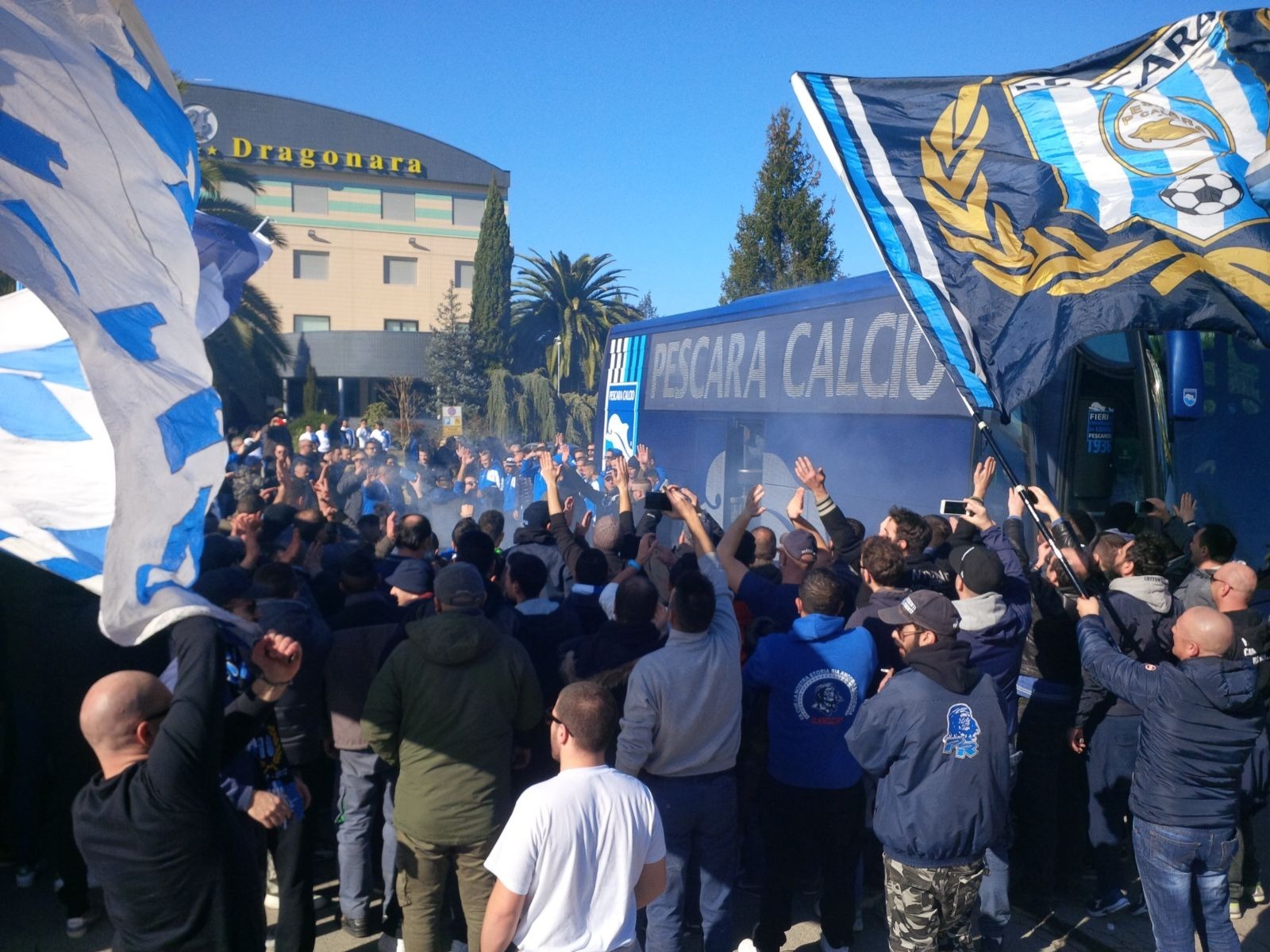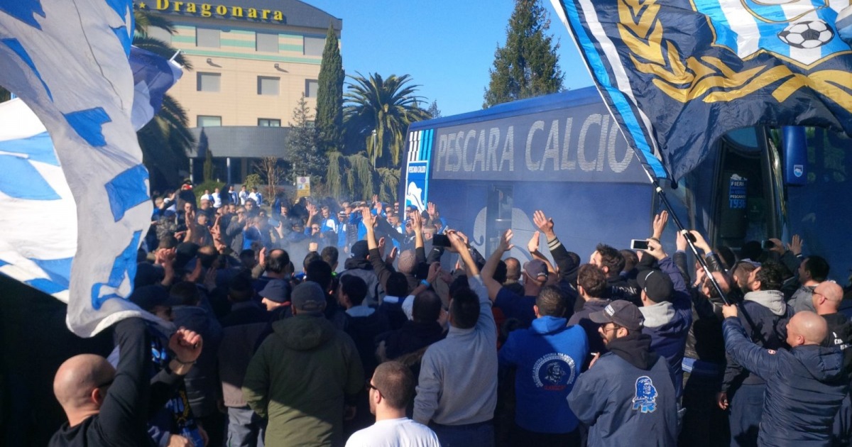 TRASFERTA VIETATA PER GLI ULTRAS BIANCAZZURRI MA LA PASSIONE NEL CUORE BRUCIA ANCORA DI PIU'. C'erano 200 ultras del Pescara poco fa davanti all'Hotel Dragonara per salutare la squadra biancazzurra in partenza per Salerno dove, domani, si disputarà un difficilissimo match (ma alla portata del Delfino) in chiave promozione in Serie A. Come è noto a tutti il Viminale ha deciso di vietare la trasferta ai tifosi del Pescara che ormai vengono trattati come quelli più cattivi d'Italia, cosa assolutamente falsa, iniusta e non veritiera (chi vi scrive è tra loro).