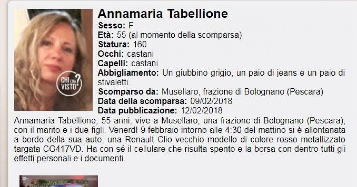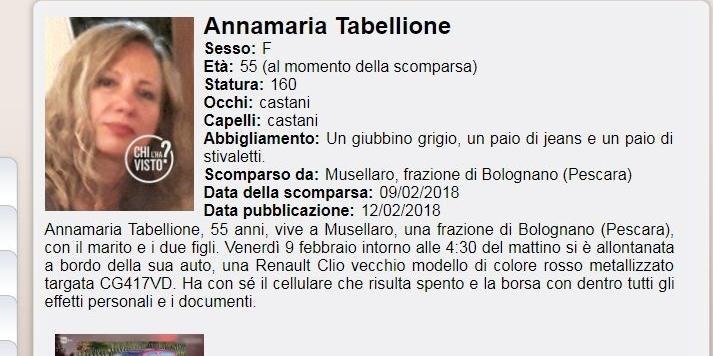 TROVATA MORTA SULLA SPIAGGA LA DONNA SCOMPARSA DAL PESCARESE VENERDI' SCORSO. Era sulla spiaggia di Termoli, all'altezza del lido 'La Lampara', il corpo senza vita di Annamaria Tabellione, 55 anni, di Musellaro di Bolognano, nel Pescarese. Della donna si erano perse le tracce dall'alba di venerdì 9 febbraio. La sua scomparsa era stata subito denunciata da familiari: il marito e i due figli.