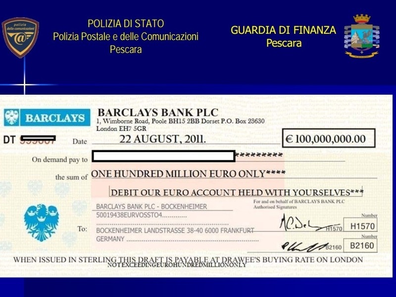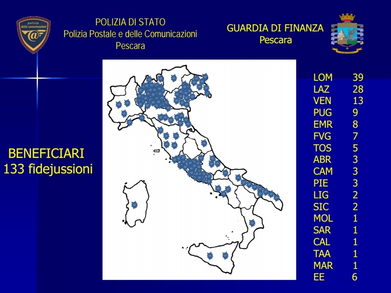 PESCARA. SCOPERTA MAXI TRUFFA. Una maxi truffa da 230 milioni di euro è stata scoperta dalla Polizia Postale di Pescara e dalla Guardia di Finanza, coordinata dalla procura della Repubblica di Pescara. Un giro milionario di false fidejussioni e false polizze fidejussorie - uno strumento indispensabile per lavorare nel commercio - create tramite l'utilizzo di false documentazioni di società di credito. Il meccanismo fraudolento prevedeva l'utilizzo di un sito web fraudolento e degli indirizzi email, ai danni di ignari clienti che hanno sottoscritto polizze e false fidejussioni credendo di interagire con degli istituti di credito e società esistenti. Nel raggiro sono finite diverse società italiane tra Abruzzo, Piemonte, Lazio, Lombardia e Marche, oltre ad importanti società calcistiche.
