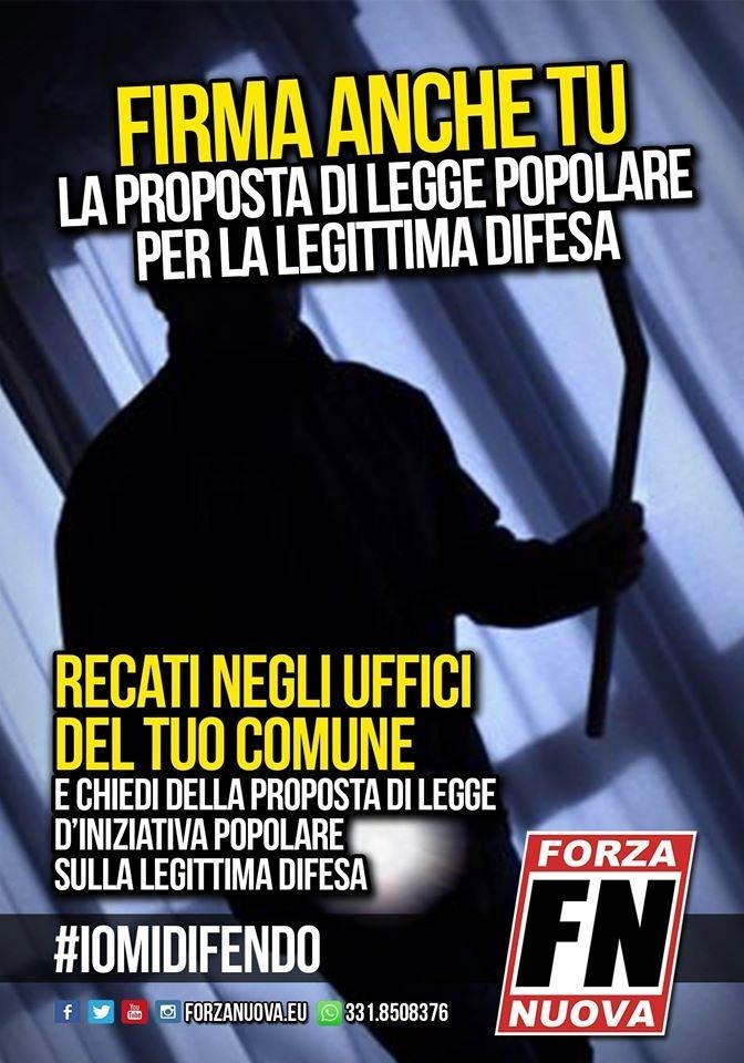 "Siamo e saremo - scrive FN - al fianco di quei cittadini che hanno a cuore le sorti di questa città sostenendoli in prima linea. Vi invitiamo fin da ora come primo passo a recarvi negli uffici comunali per firmare la proposta di legge d'iniziativa popolare sull'inviolabilità del domicilio e la Legittima Difesa".