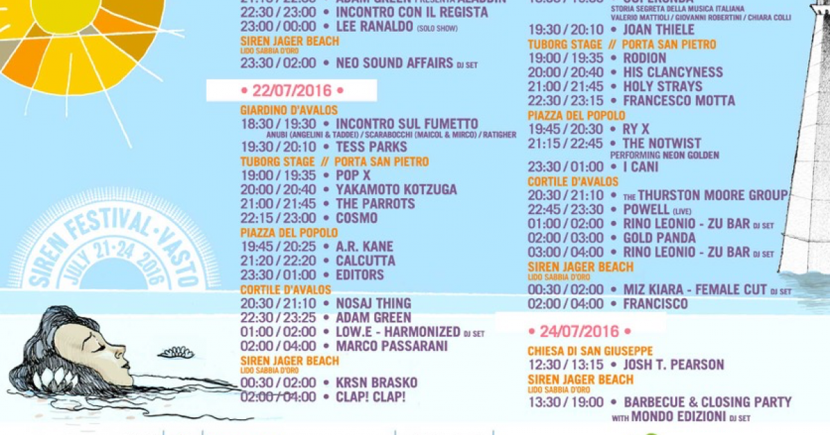 E' TUTTO PRONTO PER IL SIREN FESTIVAL 2017. E' tutto pronto per l'edizione 2017 del Siren Festival, evento musicale che si distingue da tutti gli altri offrendo esperienze concertistiche più intime in luoghi come il Palazzo D'Avalos, palazzo del XV secolo su una collina che domina il Mar Adriatico. I partecipanti potranno inoltre sperimentare la cultura locale, il cibo e il vino mentre si godono le spiagge incontaminate della Bandiera Blu di Vasto, la riserva naturale Punta Aderci e i vicini parchi nazionali nelle montagne Maiella. La musica presentata al Siren Festival presenterà una musica indipendente, soprattutto alt rock / indie pop, come jazz e blues. Gli artisti e gli artisti includeranno quelli provenienti dagli Stati Uniti, dall'Italia, dal resto dell'Europa e da noti artisti provenienti dal resto del mondo. Altre forme d'arte saranno anche parte del Siren Festival, come film e video, poesie / parole-commedia, dipinti, fotografia, scultura e installazioni d'arte. Alcune delle opere esposte al festival saranno create dai musicisti che si esibiscono al festival, così come dai membri del pubblico. Oltre alla festa di fine settimana, ci saranno spettacoli di giorno, mostre e eventi in luoghi speciali in città e nei padiglioni della spiaggia di Vasto Marina. Oltre alla musica e all'arte, Siren Festival ospiterà la cucina straordinaria ei vini di Vasto e della zona locale. È questa combinazione di musica, arte, cucina locale e vini, le spiagge della Bandiera Blu e la bellezza naturale dell'abruzzo che darebbe Siren Festival il suo vantaggio competitivo e la rendono un'esperienza veramente unica per coloro che frequentano.