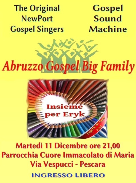 GOSPEL E SOLIDARIETA'. PROGETTO DEL CUORE 2012. Martedì 11 dicembre a Pescara, alle ore 21.00, presso il Santuario del Cuore Immacolato di Maria in viale Vespucci 45, avrà luogo il concerto dell’Abruzzo Gospel Big Family: formazione composta da 80 coristi appartenenti a due cori gospel - the Original Newport Gospel Singers di Pescara e i Gospel Sound Machine di Chieti – che uniscono le loro forze, canore e non, per il Progetto del Cuore 2012 - “Insieme per Eryk”. Il Progetto del Cuore, ideato e promosso annualmente dall’ Associazione Corale "The Original Newport Gospel Singers", consiste nel prestare la propria voce al racconto di una storia significativa e al supporto di una buona causa mediante un concerto gospel con relativa raccolta fondi. La settima edizione del Progetto è dedicata al piccolo Eryk, un bimbo affetto da una malattia molto impegnativa e che con la sua famiglia sta attraversando non poche difficoltà.