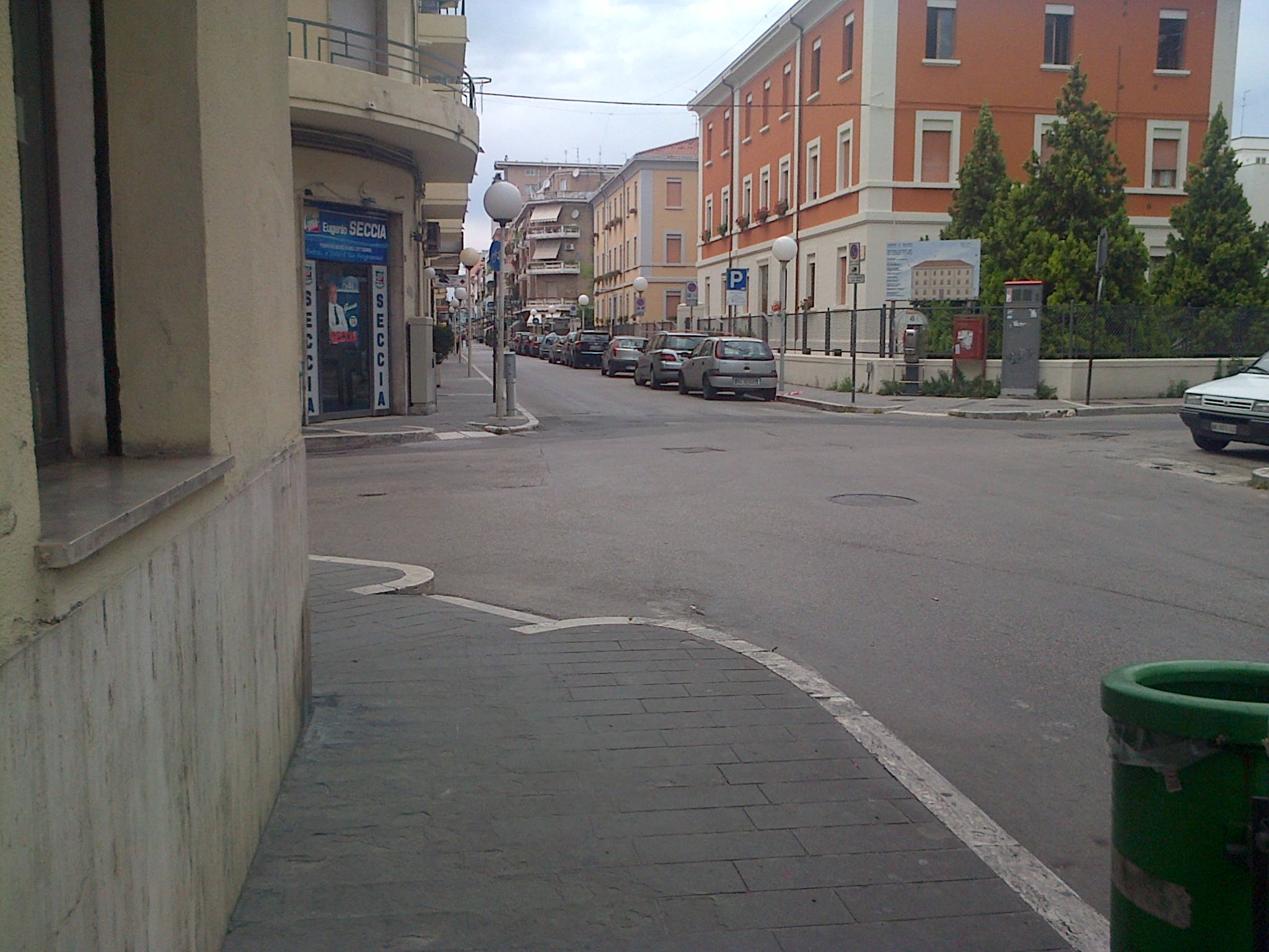 Finalmente raggiungo il bancomat ma, con grande sorpresa, scopro che non è agibile per me: cioè il gradino è così alto che m'impedisce di raggiungere lo sportello e prelevare. Decido di proseguire per corso Umberto I. Sulla strada mi imbatto in un altro amico, collega, che mi chiede che cosa mi sia capitato. Gli spiego brevemente la cosa e proseguo, più agevolmente, vista la pavimentazione verso il cuore di Pescara.
