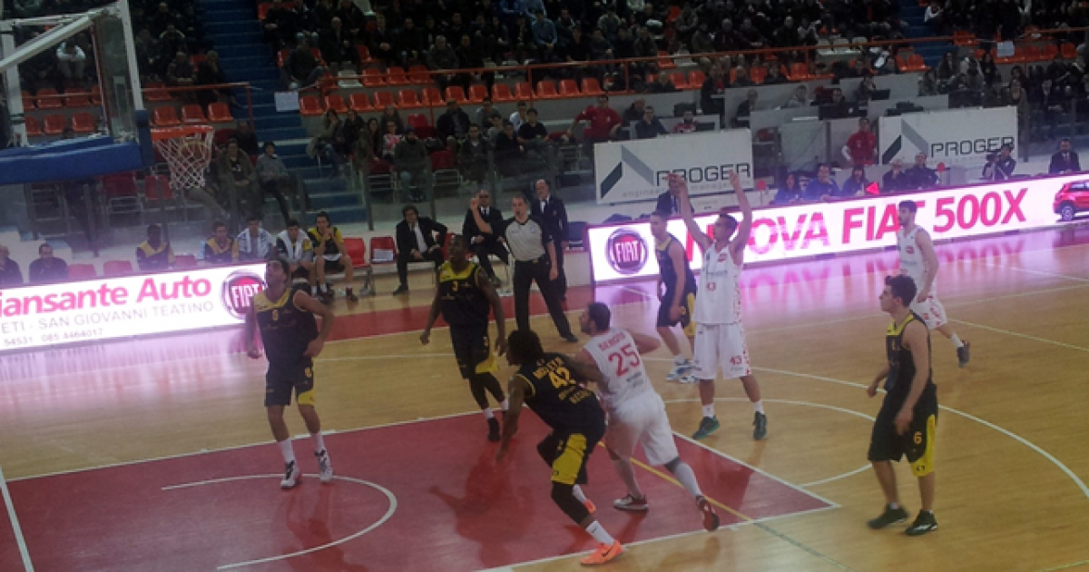 UNA PROGER TUTTO CUORE E PERSONALITA’ ANNIENTA RECANANATI. Difficilmente qualche mese fa avremmo pensato di poter parlare di una Proger Chieti così ben strutturata. Certo, erano stati tanti i segnali negli ultimi tempi, non ultimi quelli della scorsa settimana in terra della capolista trevigiana, di una squadra che si stava compattando in modo eccellente, ma alla lunga sta uscendo fuori il lavoro di coach Galli che, in silenzio e con grande umiltà, sta cementando una squadra totalmente nuova e giovanissima. I ragazzi stanno provando a centrare un’impresa storica per una città che aspetta da trent’anni il ritorno nella massima serie. E lo stesso cuore dei tifosi teatini sta sempre più perdendo quell’atteggiamento da salotto che ha contraddistinto il Palaleombroni negli ultimi anni, per tornare ad essere quel pubblico caldo che da sempre ha contraddistinto la città teatina. La gara odierna, molto corretta tra giocatori e pubblico, è stata un susseguirsi di emozioni, intervallata da alcuni interventi più che egocentrici di uno dei tre arbitri, Vanni Degli Onesti, che ha provato a giocare la sua partita, come spesso gli accade. I marchigiani provano subito a far paura con una schiacciata di Mosley, una tripla di Pierini, una di Eliantonio ed un contropiede di Sykes fissando il punteggio sul 9-15 al primo timeout richiesto dalla panchina della Proger. I teatini appaiono un po’ frastornati, complice anche la violenta influenza che in settimana ha colpito molti componenti della squadra, e chiudono la prima frazione sotto di 4 punti, tra varie imprecisioni al tiro ed una difesa non all’altezza delle ultime gare. Solo Ancellotti sembra tenere alta la concentrazione, soprattutto in fase rimbalzi. Nel secondo quarto Recanati prova ad allungare, portandosi 26-36 sul terzo fallo personale di Paesano, innervosito anche da alcune decisioni arbitrali a dir poco dubbie, e 27-42 con una tripla di Sykes. Anche i marchigiani risentono di tali decisioni che scombussolano gli equilibri in campo, fino alle proteste di coach Sacco, che viene punito con un fallo tecnico. Ma la nota positiva in casa Proger si chiama ancora una volta Sollazzo, che inizia a salire in cattedra con le sue triple e chiudendo la prima frazione 42-46. La terza frazione va avanti più o meno come la precedente, con Recanati che trova in ottima serata Zanelli in regia e Sykes sotto i tabelloni e Chieti che prova a ridurre le realizzazioni marchigiane aumentando la pressione difensiva. Sarà questa infatti la chiave vincente dell’ultima frazione, unitamente alla stanchezza di Sykes ed alle triple di Ancellotti ad 1.48 dal termine e di Sollazzo ad 1 minuto. Sacco chiede timeout sul 78-78, provando a riordinare la sua squadra, ma i tiri liberi ed una schiacciata finale di Sollazzo fissano la gara sul 83-78 per la Proger.