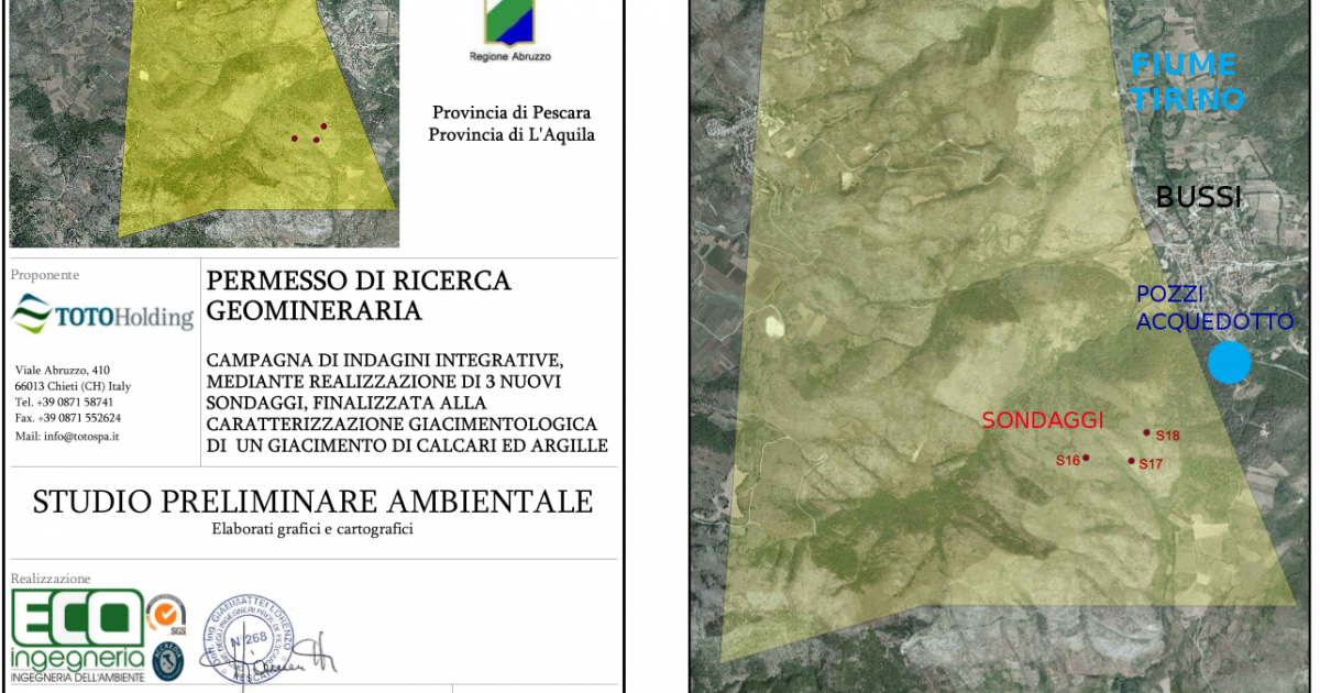 Nell’attuale richiesta di parere avanzata al Comitato Valutazione di Impatto Ambientale della Regione Abruzzo l’azienda Toto Spa vorrebbe scavare 3 sondaggi, da attrezzare poi a piezometri (quindi fissi) di 120-200 metri di profondità fino a raggiungere la falda acquifera finalizzati alla progettazione di una megacava su centinaia di ettari di territorio a cavallo tra Bussi, Collepietro e Popoli.