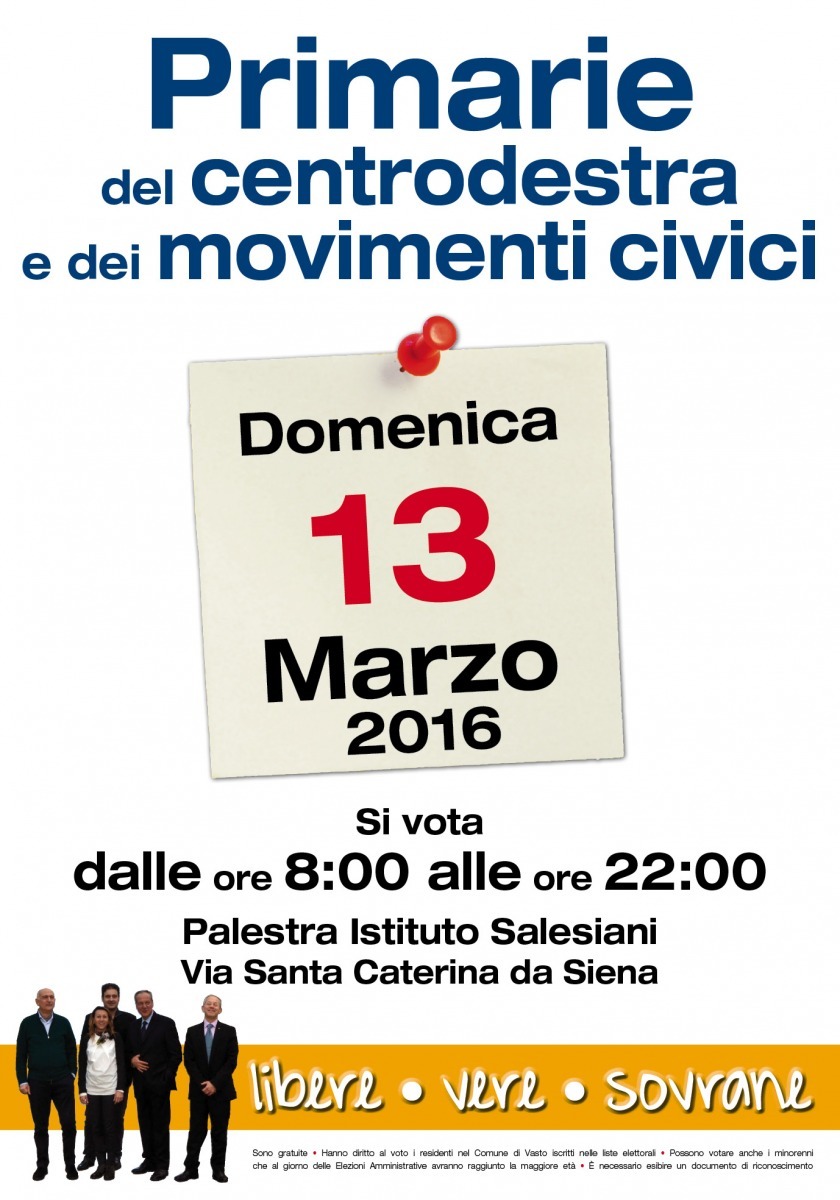 VASTO, PRIMARIE CENTRODESTRA E MOVIMENTI CIVICI: SI VOTA DOMENICA. Si terranno Domenica 13 marzo, presso la Palestra Istituto Salesiani, in Via Santa Caterina da Siena a Vasto, le elezioni primarie del centrodestra e dei movimenti civici per la scelta del candidato Sindaco unitario.