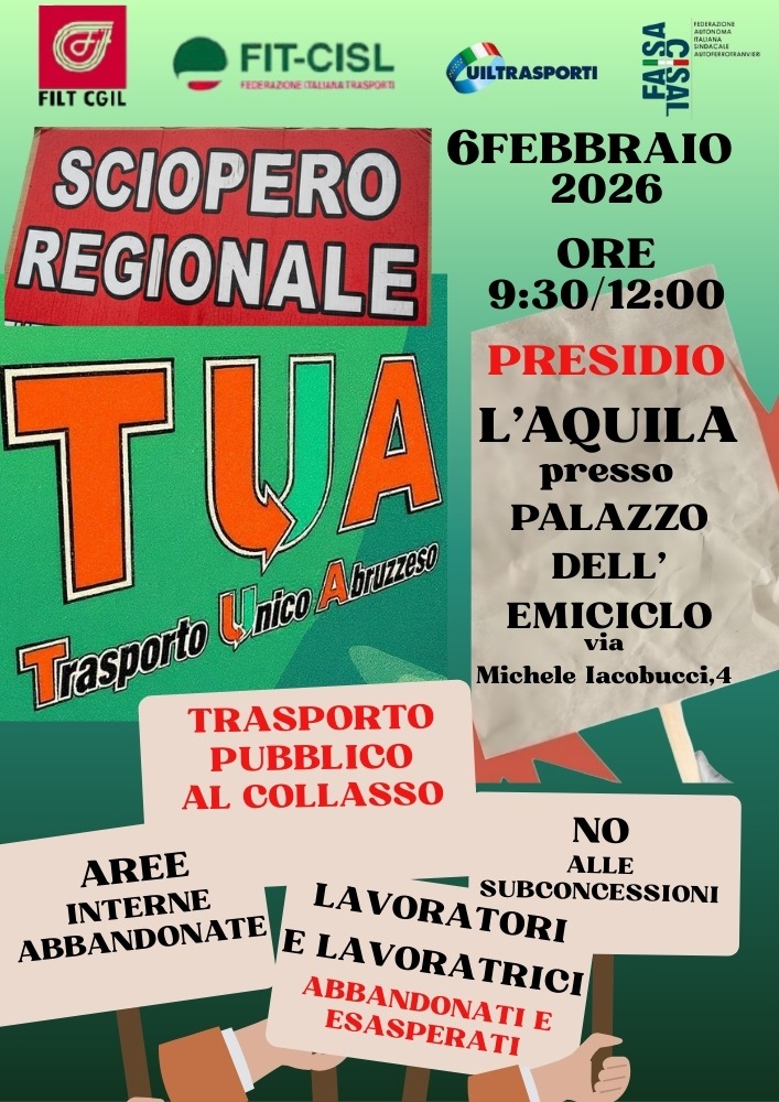 Venerdì "rosso" per quanto riguarda il trasporto pubblico abruzzese. Le Segreterie Regionali Filt Cgil, Fit Cisl, Uiltrasporti e Faisa Cisal hanno annunciato lo sciopero regionale per la giornata del 6 febbraio con tanto di presidio, alle ore 09.30, davanti al Palazzo dell'Emiciclo a l'Aquila. La protesta riguarda la "gestione assolutamente inadeguata del trasporto pubblico abruzzese", scrivo i sindacati. Sotto la lente la riduzione del sevizio soprattuto nelle aree interne dell'Abruzzo ma non solo.