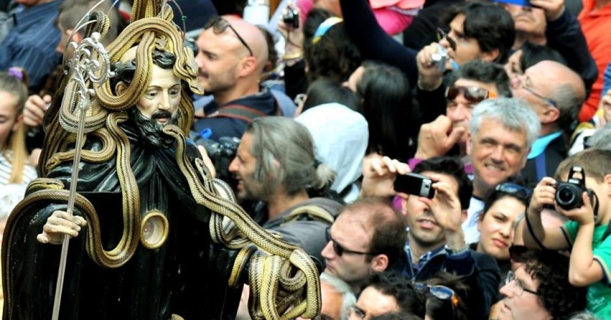 ABRUZZO IN DELIRIO PER LA FESTA DEI SERPARI. Ogni anno, il primo di maggio, il piccolo paese di Cocullo, solo 246 anime nella comunità montana peligna, riesce ad accaparrarsi il palmares del luogo più visitato della nostra regione grazie ad una festa sacra-profana meglio nota come la Festa dei Serpari.