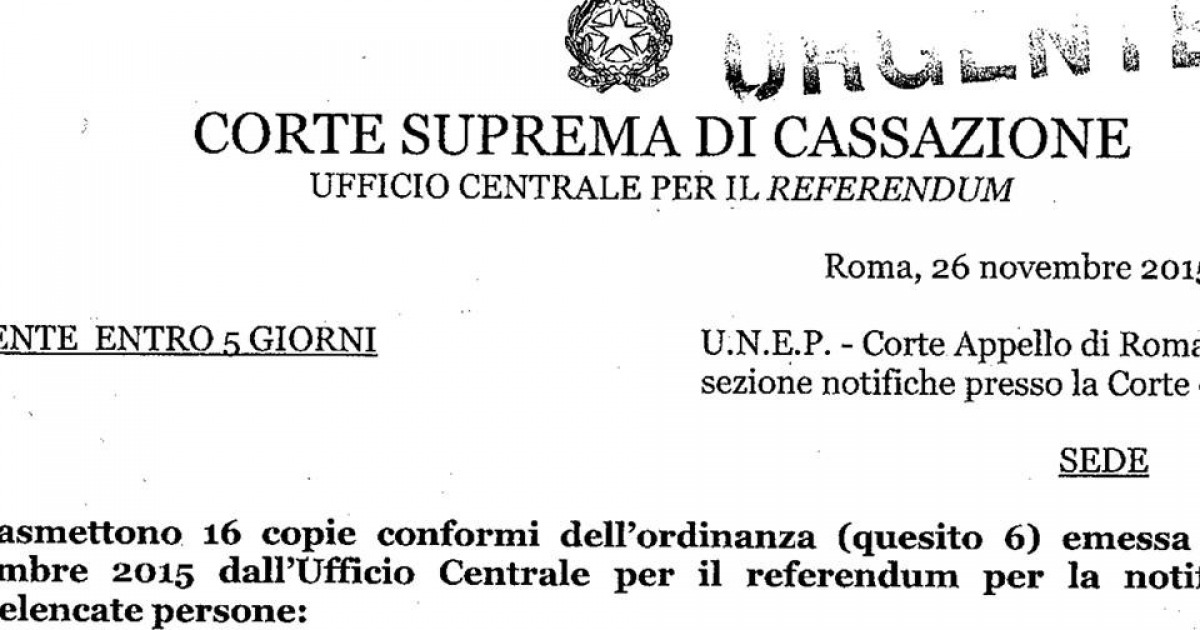 VIA LIBERA DELLA CORTE DI CASSAZIONE AL REFERENDUM "NO TRIV". Con due ordinanze adottate ieri, 26 novembre 2015, la Corte di Cassazione ha accolto i sei quesiti referendari così come formulati e deliberati dai consigli regionali della Basilicata, dell'Abruzzo, delle Marche, della Campania, della Puglia, della Sardegna, del Veneto, della Liguria, della Calabria, del Molise.