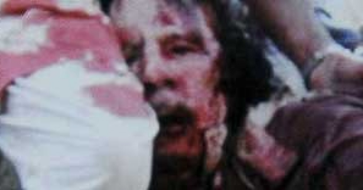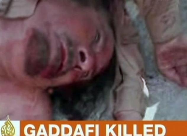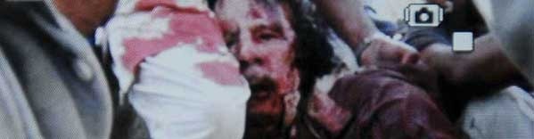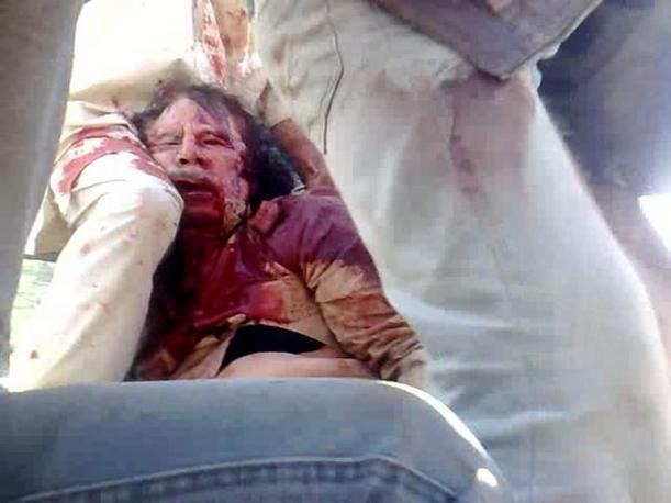 La prima foto di Gheddafi dopo la cattura dentro una buca scavata nei pressi di Site. Uno scatto che potrebbe passare alla storia. Pubblicato dall'Afp, Agence France Presse, è stato scattato da Philippe Desmazes. L'immagine ripresa forse con un cellulare mostra il display di una fotocamera (o di una telecamera) in mano ad uno degli uomini che hanno preso parte alla sparatoria. Lo schermo segna le ore 12.23 del 20 ottobre.