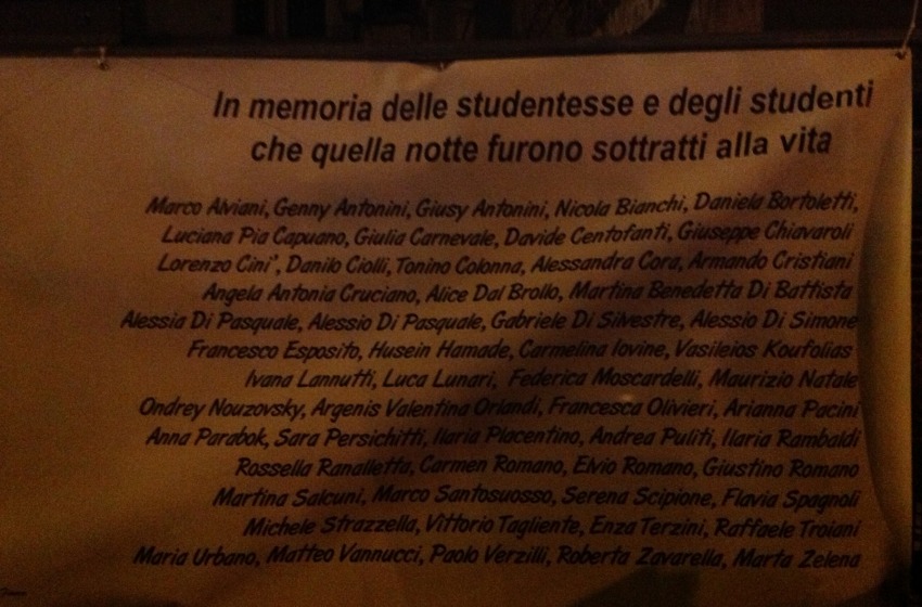 QUARTO ANNIVERSARIO DEL TERREMOTO....309 vittime, migliaia di feriti, dieci miliardi di euro di danni. Tutto questo non basta per descrivere la tragedia del terremoto del 6 aprile 2009. L'Aquila, capoluogo d'Abruzzo, una città di anime mutilate, si è illuminata con migliaia di "luci del dolore" per celebrare quelle vite e qui sogni spezzati in pochi istanti alle 3,32 di quatto anni fa.