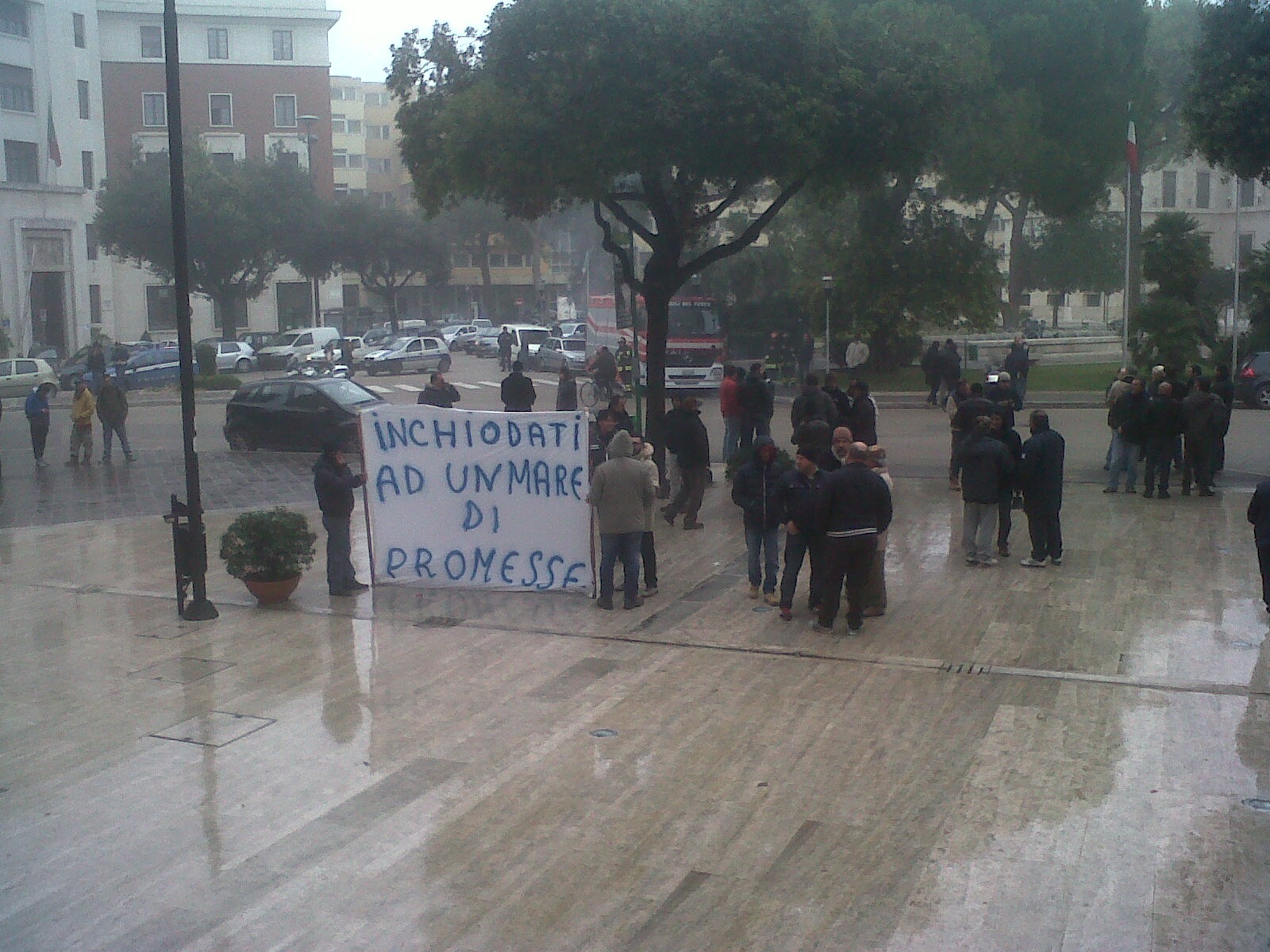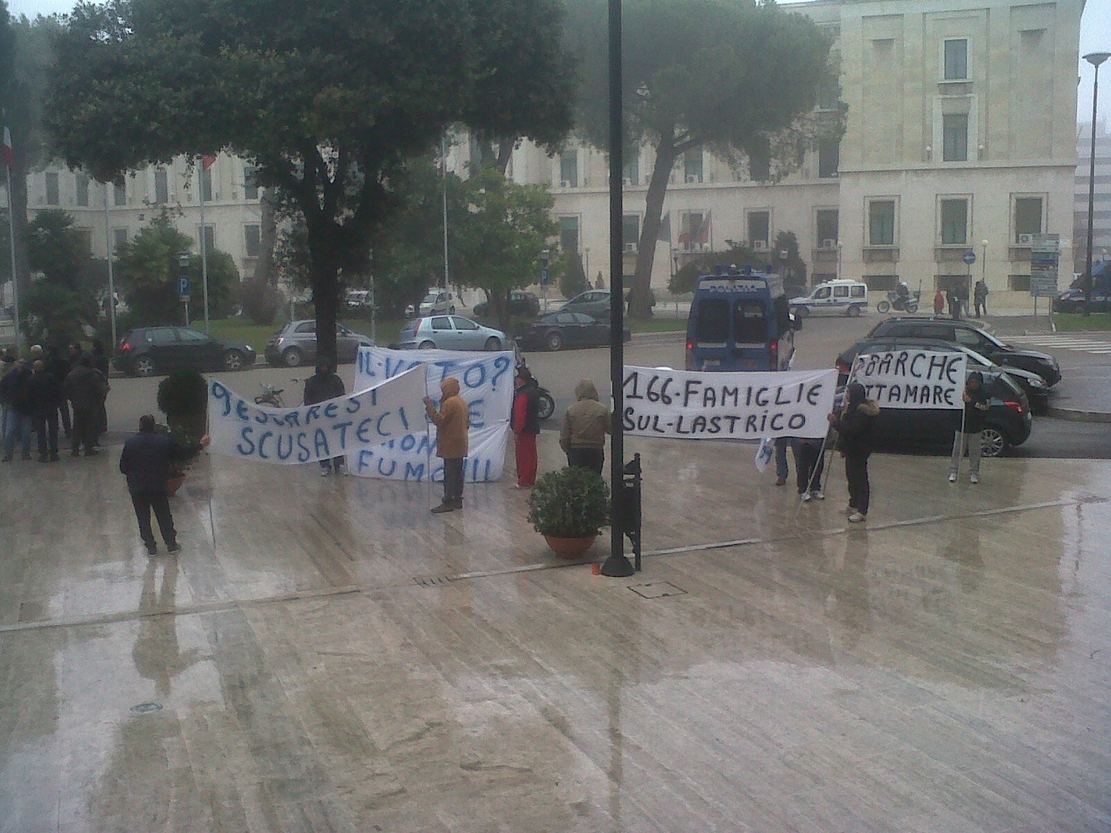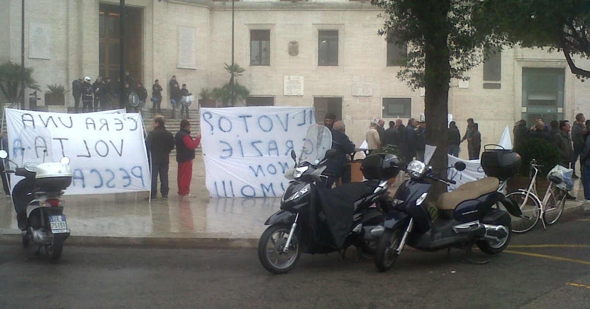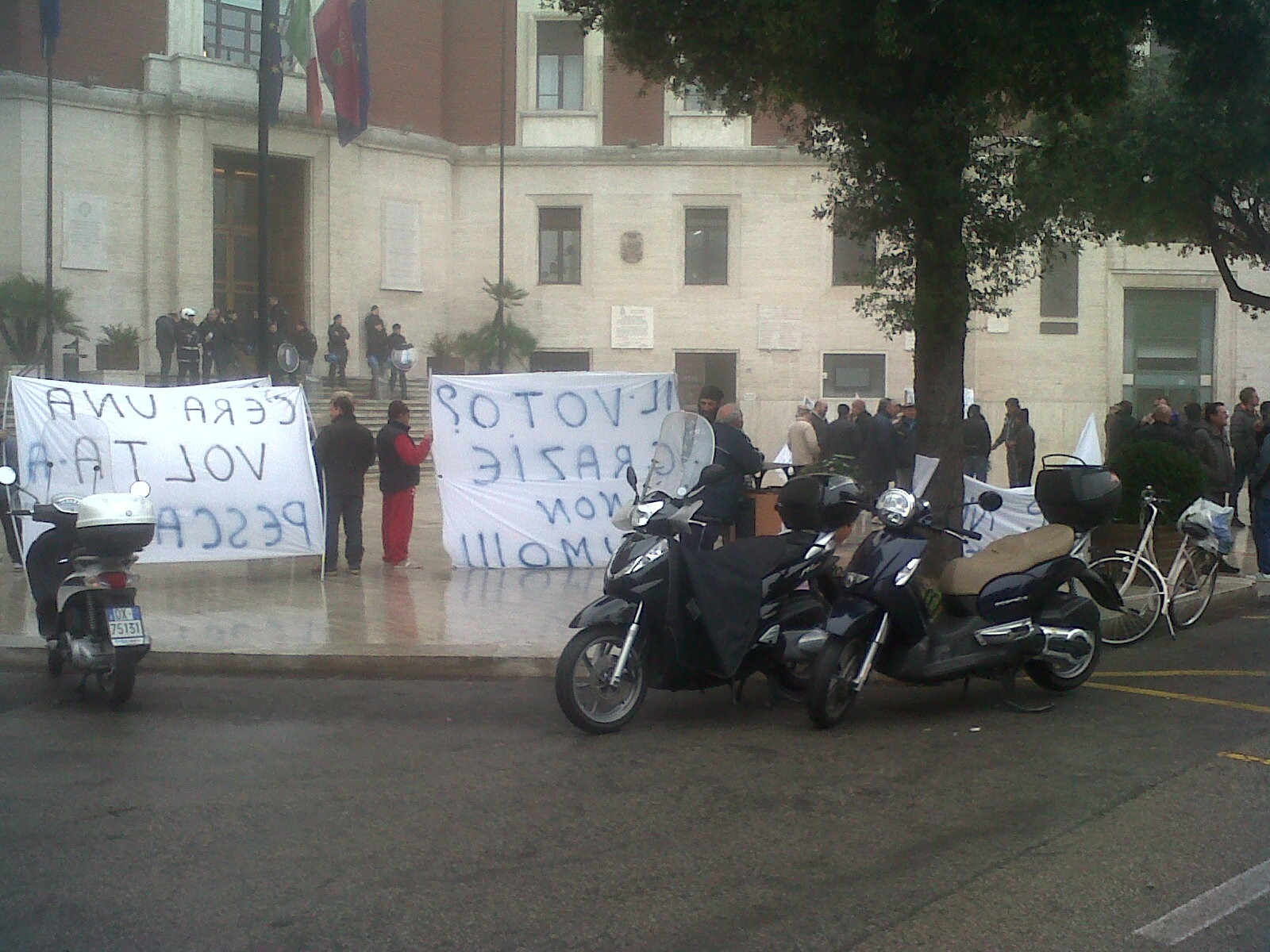 VICENDA PORTO DI PESCARA. I PESCATORI A CHIODI «ABBIAMO FAME». «Abbiamo fame. Non ne possiamo più. Non ci interessa solo la cassa integrazione. Se ci fate lavorare, se ci fate tornare in mare, noi non ne abbiamo bisogno». Queste le parole dei pescatori della Marineria di Pescara, 166 famiglie sul lastrico, al trio Chiodi-Mascia-Teste. I marinai, alle ore 10, avevano bloccato piazza Italia a Pescara con n corteo pacifico e colorato allo scopo di denunciare il dramma del mancato dragaggio del porto, ma soprattutto il mancato accordo tra Regione, Inps e la banca Caripe, garante dell'operazione di anticipo della cassa integrazione 2012. «Quando abbiamo saputo - spiega Grossi nella sala Giunta del Comune di Pescara - che l'accordo per la Cig aveva avuto problemi ci siamo sentiti togliere la terra dai piedi. Noi vogliamo lavorare, vogliamo tornare in mare, e sembra che pure la questione dragaggio stia avendo dei problemi». Il rappresentante degli armatori si riferisce ai lavori per il dragaggio del porto di Pescara che dovrebbe consentire alle barche di tornare in mare entro il 25 marzo ma che al momento non sono ancora iniziati. «Ci sono famiglie che stanno aspettano i soldi della cassa integrazione - aggiunge Grossi - ma non stiamo parlando di cifre importanti. Qu si tratta per sei mesi di non lavoro di circa 1200-1800 euro in totale. Non sono nulla per mandare avanti le famiglie, pagare le spese e dare da mangiare ai figli. E questa cosa è inaccettabile che nemmeno questi pochi soldi sono arrivati per problemi burocratici». Insomma una situazione insostenibile che però vede l'impegno massimo delle Istituzioni (Comune, Provincia e Regione) ma che fin'ora si è rivelato inefficace.