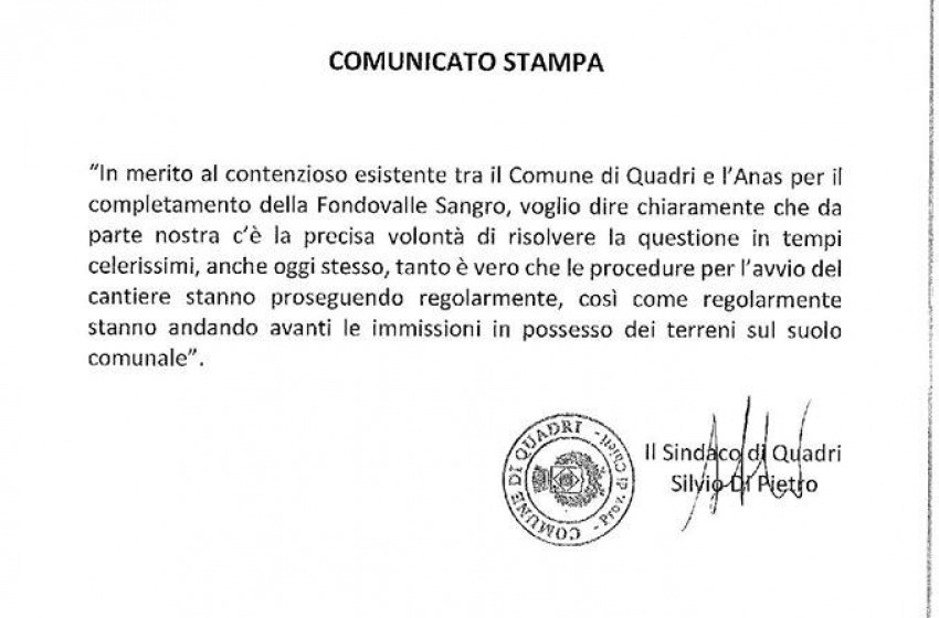 FONDOVALLE SANGRO: FIRMATO IL MEGA APPALTO DA 190MILIONI TRA ANAS E DE SANCTIS COSTRUZIONI. Il contratto tra l'Anas e la De Sanctis Costruzioni per...