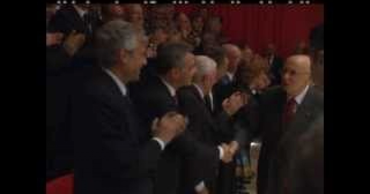 Il presidente della Repubblica Giorgio Napolitano, ieri a l?aquila, per la prima mondiale del concerto di Claudio Abbado e la Mozart Orchestra (J.S. Bach concerto n.2 in do minore) nel nuovissimo Auditorium del Parco, realizzato in legno di acero rosso, dall'architetto Renzo Piano. All'inaugurazione tante le autorità ed i personaggi famosi: c'era anche il Premio oscar Roberto Benigni.